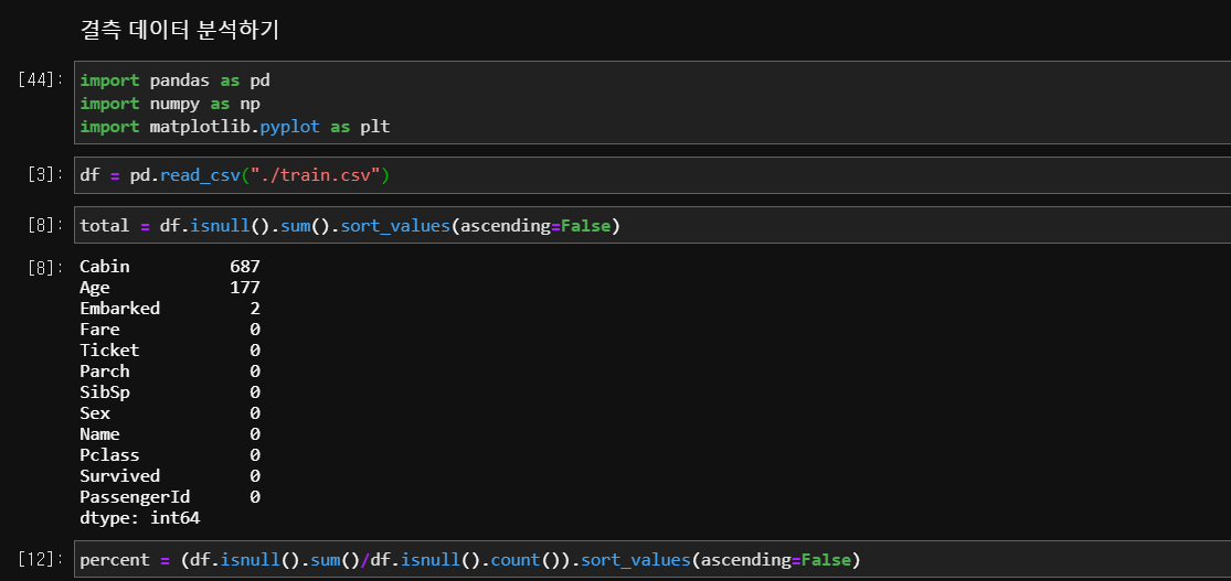 sort_valuses 를 이용해서 각 데이터를 뽑아주고 제일 중요한 isnull()을 이용해서 결측치를 나타내 줍시다. isnull() 함수는 각 결측치를 부울함수로 나타내 줍니다. sum()을 사용하면 결측된 데이터의 값이 더해 져서 나오게 됩니다.